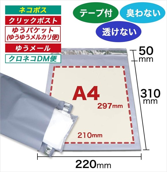 ネコポスで送れるギリギリのサイズの宅配ビニール袋(220x310+50mm)グレーです。